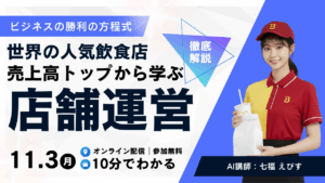 コース 並べ替え: 公開日(最新) 公開日(最古) 高い順 安い順 人気 (最も閲覧) 検索条件を設定する カテゴリ 料金 業種 分野 コース属性 料金 有料コース (7) 無料コース (6) 業種 飲食 (11) 全業種共通 (2) 分野 全分野共通 (8) 接客 (5) ステータス 注目 Hot New スペシャル すべてリセット お気に入り追加 【飲食店運営DX④】飲食店の集客ファネル設計 中級 10 講義 2時間 会員限定 プレビュー お気に入り追加 【飲食店運営DX③】飲食店ブランド戦略アーキテクチャ 中級 10 講義 2時間 会員限定 プレビュー お気に入り追加 【飲食店運営DX②】飲食店DXの厳選AIツール10選 初級 10 講義 2時間 会員限定 プレビュー お気に入り追加 【飲食店運営DX①】AI活用と飲食店DXガイドライン 初級 10 講義 2時間 会員限定 プレビュー お気に入り追加 日本の人気飲食店から学ぶ店舗運営術 初級 12 講義 2時間 会員限定 プレビュー お気に入り追加 世界の人気飲食店から学ぶ店舗運営術 初級 12 講義 2時間 会員限定 プレビュー Hot お気に入り追加 日本の経営者の成功法則【勝利の方程式】 初級 6 講義 1時間 会員限定 プレビュー Hot お気に入り追加 世界の経営者の成功法則【勝利の方程式】 初級 6 講義 1時間 会員限定 プレビュー もっと読み込む